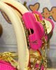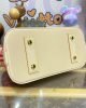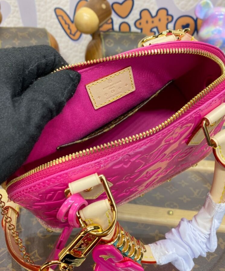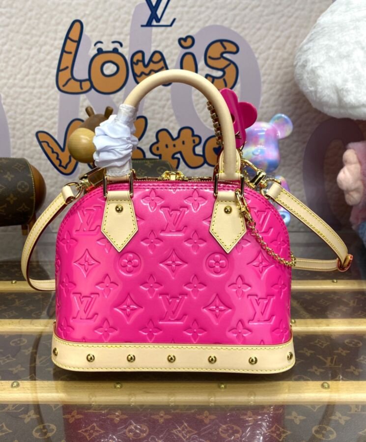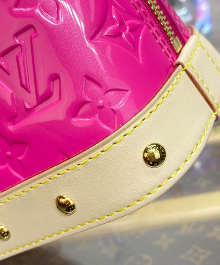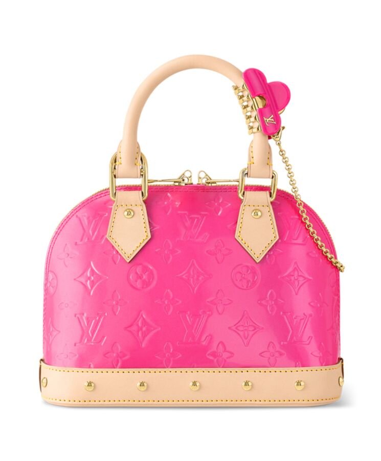 The Alma BBs distinctive Art Deco shape looks stunning in shiny Monogram Vernis leather, with natural cowhide-leather on the top handle and along the bottom. The pastel colorway and golden rivets on the handle mounts and bottom leather trim bring an on-trend feel. Each bag comes with a matching-colored hair clip.